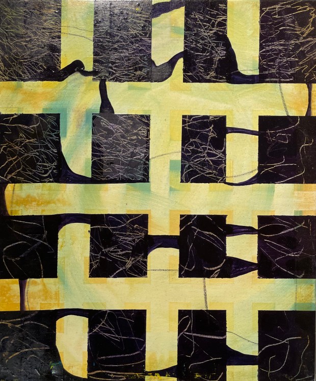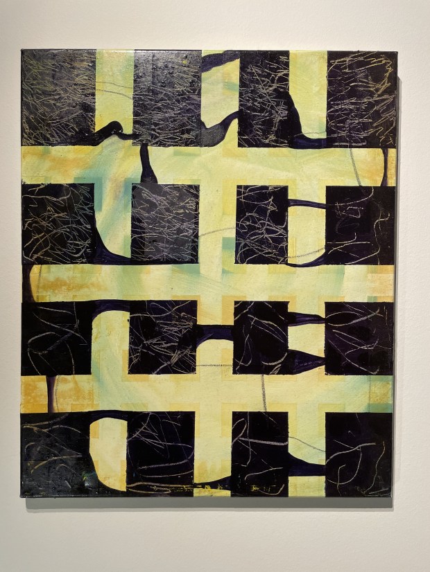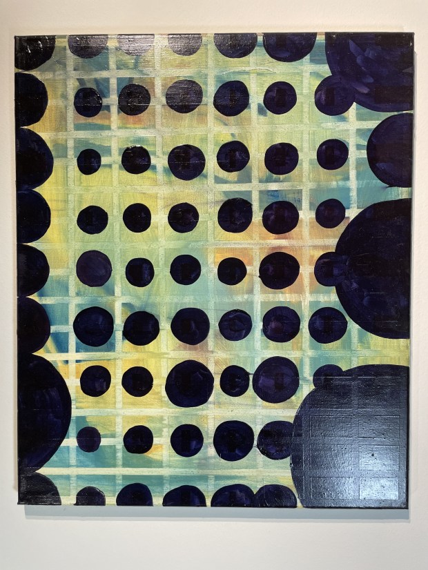 Stutt sería úr skólanum. Olía á striga. Þær eru jafnstórar systurnar, glansandi áferð, svolítið kístraðar.